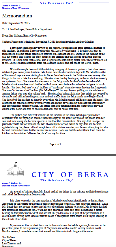 - Browns offensive line coach Andy Moeller will not face charges in the alleged domestic violence case. According to the Berea prosecutors office they could not find that "Proof of the required degree of "Beyond a reasonable doubt" could be achieved. Moeller will meet with NFL officials next week to discuss the incident. The Browns said in a statement that Andy Moeller's suspension by the team remains indefinite. We will withhold further comment until appropriate time."